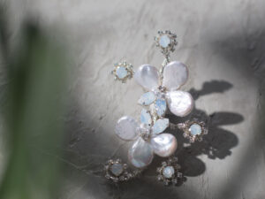 課程以珍珠母貝結合鍍銀銅線,重現蝴蝶蘭翩然飛舞的身形,並輔以鋯石與水晶提升層次感與華麗度。