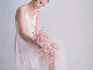 The bouquet’s elegant silhouette flows like falling sakura in a spring breeze—delicate yet striking.